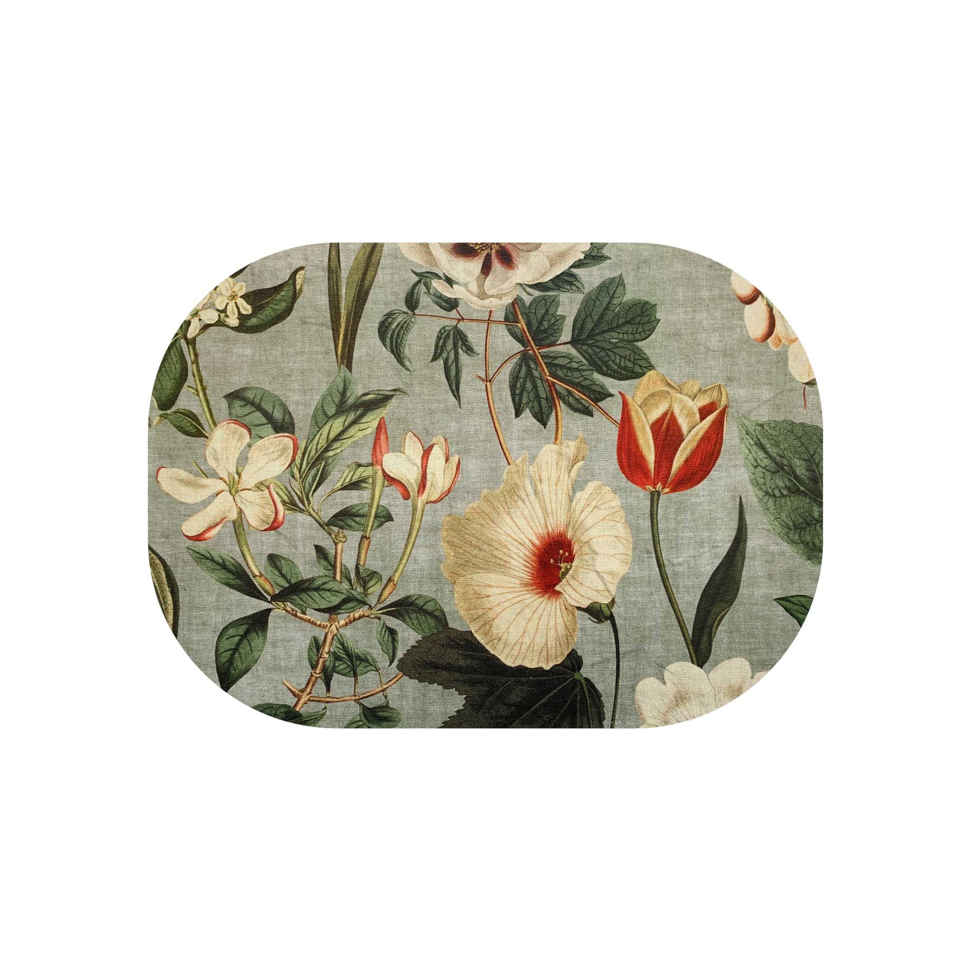 Placemat made with wood fiber, natural cork and cotton fabric depicting tulips, trumpet vines, hibiscus and anemones.