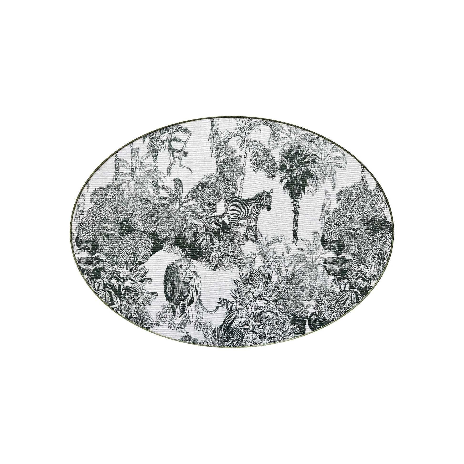 This placemat features a light-colored cotton fabric printed with colorful exotic animals and green palm trees.